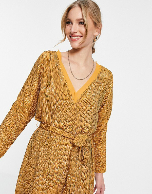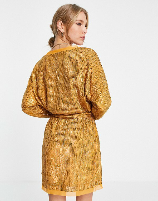 エイソス ASOS asos ASOSDESIGNリニアスパンコール装飾ミニドレスネクタイウエストディテールオレンジ ワンピース レディース 女性 インポートブランド 小さいサイズから大きいサイズまで
