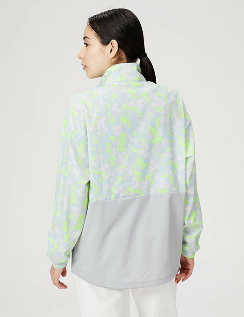 ジャケットのみでも、セットアップとしても着用可 立ち襟 左手首あたりにPUMA CATプリント 両サイドにジッパー付ポケットあり UPF 30 素材 本体:二重織(ポリエステル100%) ポケット袋:メッシュ(ポリエステル100%) 性別:ウィメンズ ★