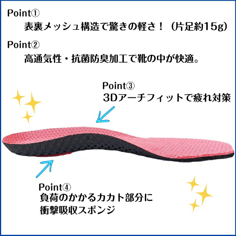 ダブルメッシュ構造が足裏の高通気と軽さを実現! ◆3D構造で足にフィット◆ 内側外側縦アーチサポート、横アーチ中足骨サポートがついた3D構造足にフィットする形状を採用。