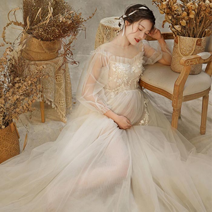 ワンピース マタニティ ドレス フォト シースルー レース 刺繍 長袖 マキシ 丈 ワンピ おしゃれ きれいめ エレガント 思い出 記念撮影 メモリーフォト 記念写真
